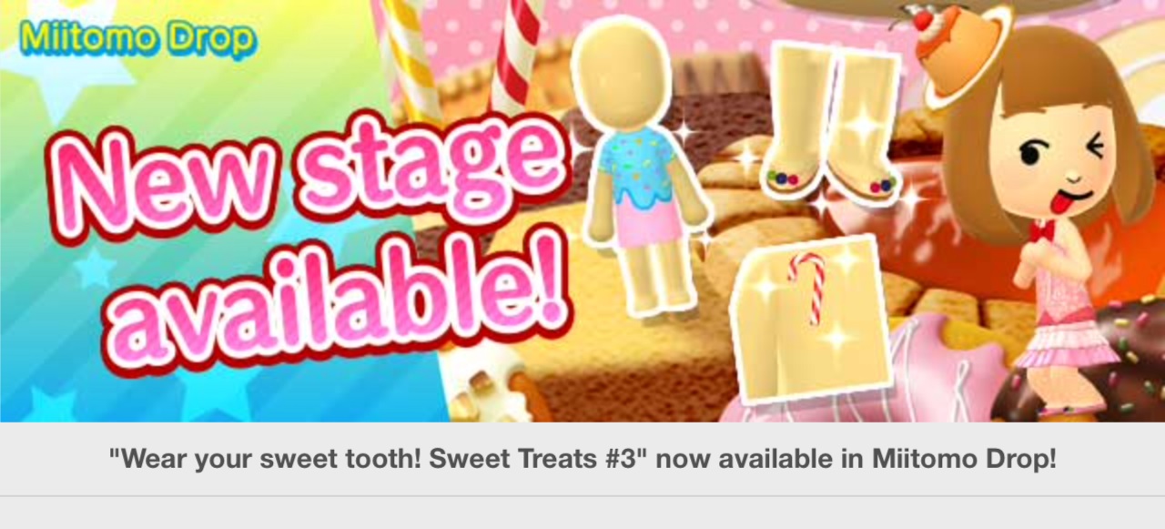 Miitomo has been updated with new content once again. Players can nab some new items in the latest Miitomo Drop stage, “Wear your sweet tooth! Sweet Treats #3”.