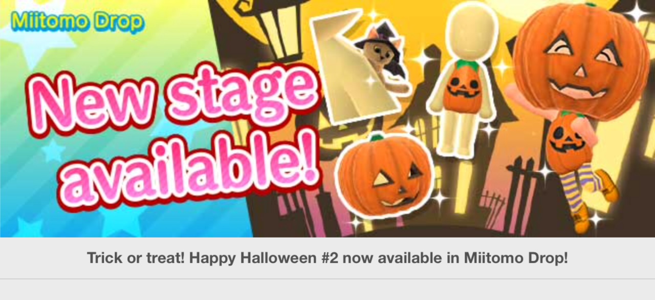 Miitomo has been updated with new content once again. Players can nab some new items in the latest Miitomo Drop stage, “Trick or treat! Happy Halloween #2”.