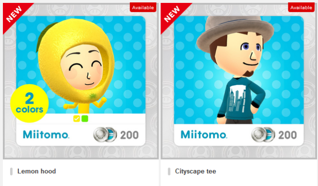 Today, two more Miitomo rewards were added to My Nintendo. Both the Cityscape tee and the Lemon Hood cost 200 Platinum Points. The Lemon Hood is available in two colors – yellow and green. Both rewards are available until November 9th.