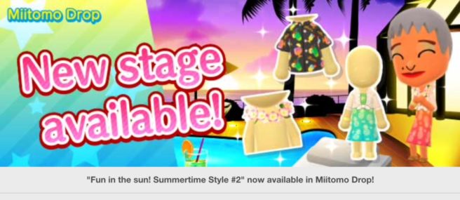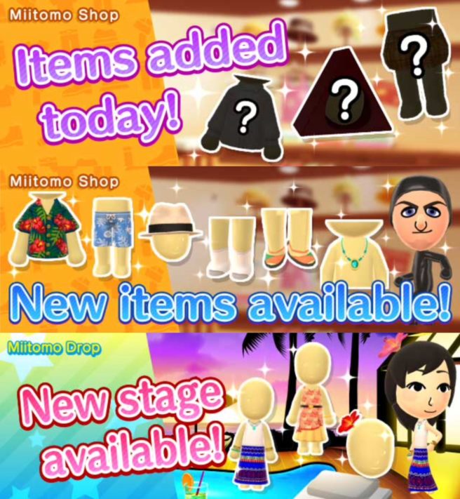 Nintendo says that new items have been added to the daily selections in Miitomo Drop. Aside from that, the company has highlighted some specific additions, including ones that have a vacation theme.