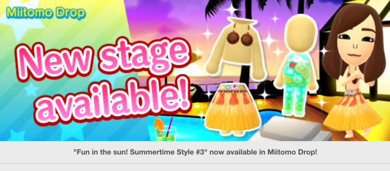 Miitomo has been updated with new content once again. Players can nab some new items in the latest Miitomo Drop stage, “Fun in the sun! Summertime Style #3”.