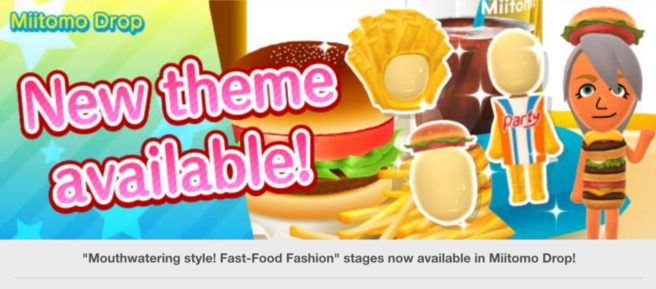 Miitomo has been updated with new content once again. Players can nab some new fast-food-based items through the latest Miitomo Drop stages, including hamburger and soft-drink outfits.