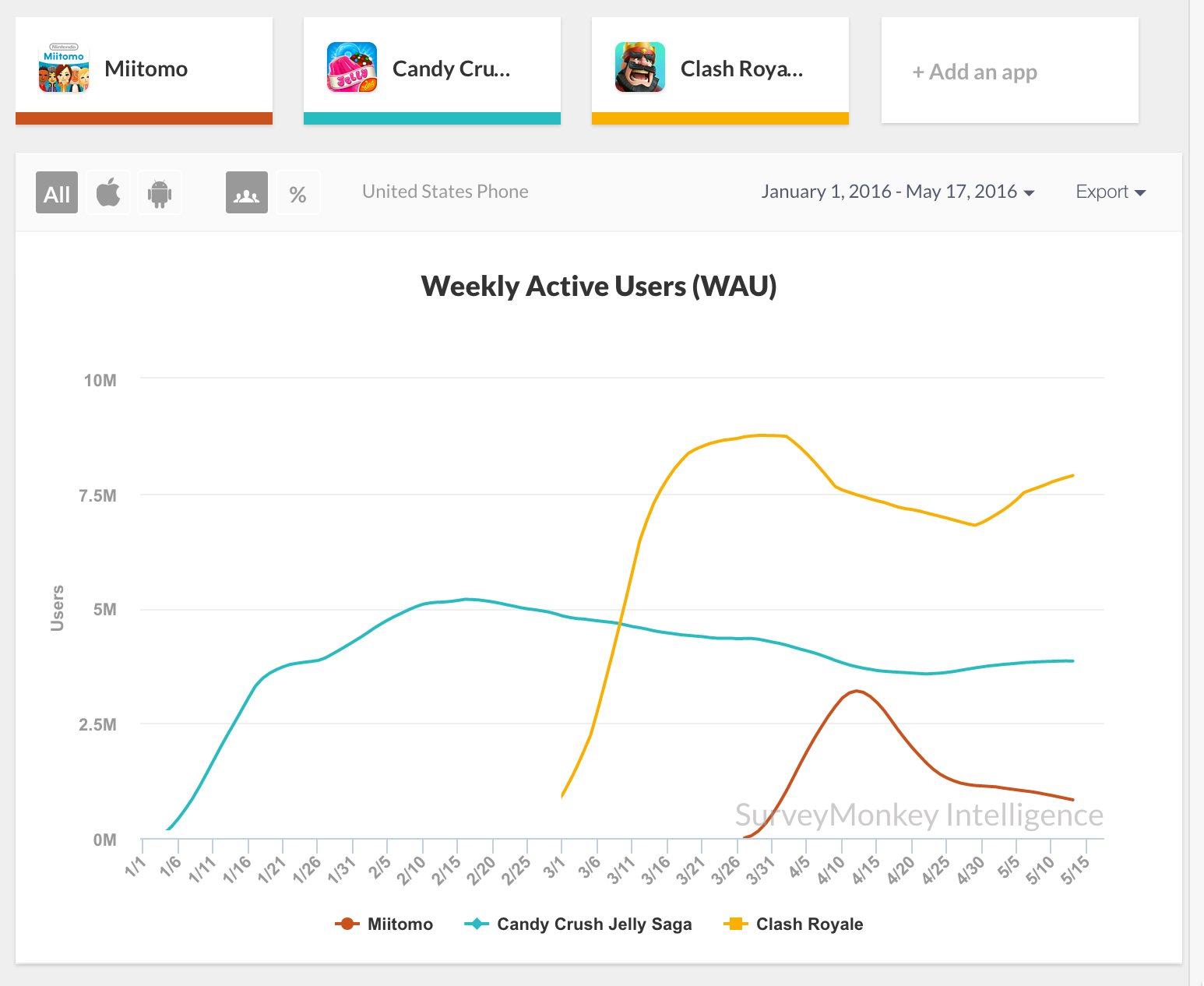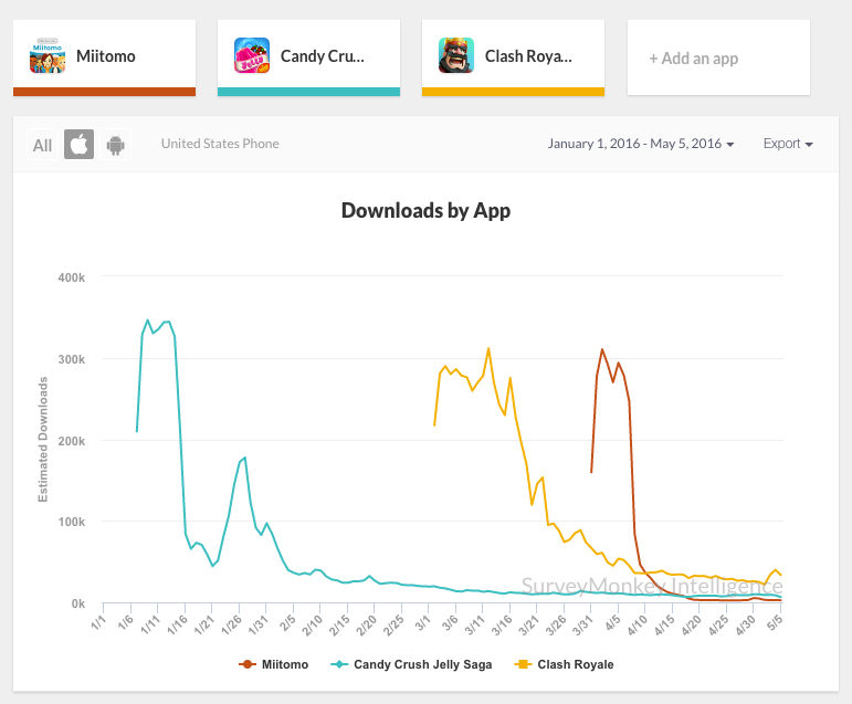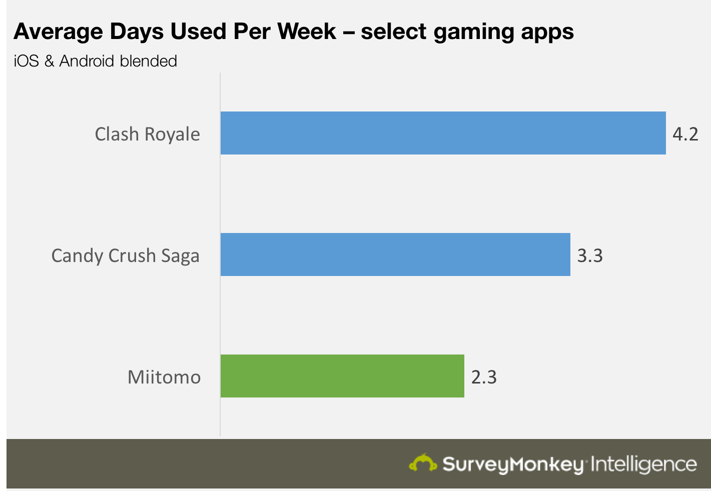 SurveyMonkey compared Miitomo to Candy Crush Jelly Saga and Clash Royale, two titles from giant mobile developers King and Supercell respectively. Miitomo stacks up favorably when it came to download performance, but the app “struggled to keep users interested.”