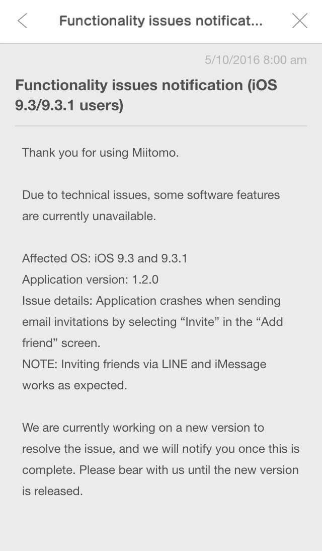 Unfortunately, we’re now hearing that there’s an issue with this functionality for iOS 9.3 / 9.3.1 users. If you send email invites by selecting “Invite” in the “Add friend” screen, Miitomo crashes.