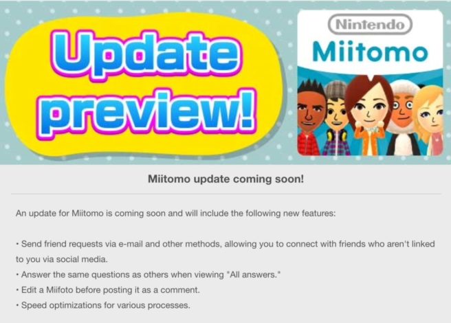 Nintendo has sent out a notice to Miitomo users, informing them about an update set to be made available in the near future.