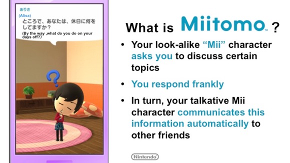 Looks like Miis go ahead and communicate with other Miis without your knowledge. This will help people who are hesitant to talk about themselves to communicate with others, and reveal a side of your friends you never knew, Mr. Kimishima says.