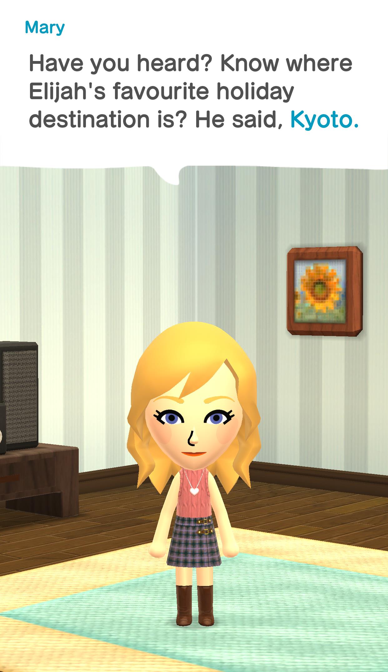 In Miitomo, your “Mii” look-alike character appears as your “alternate self” within your smart device.