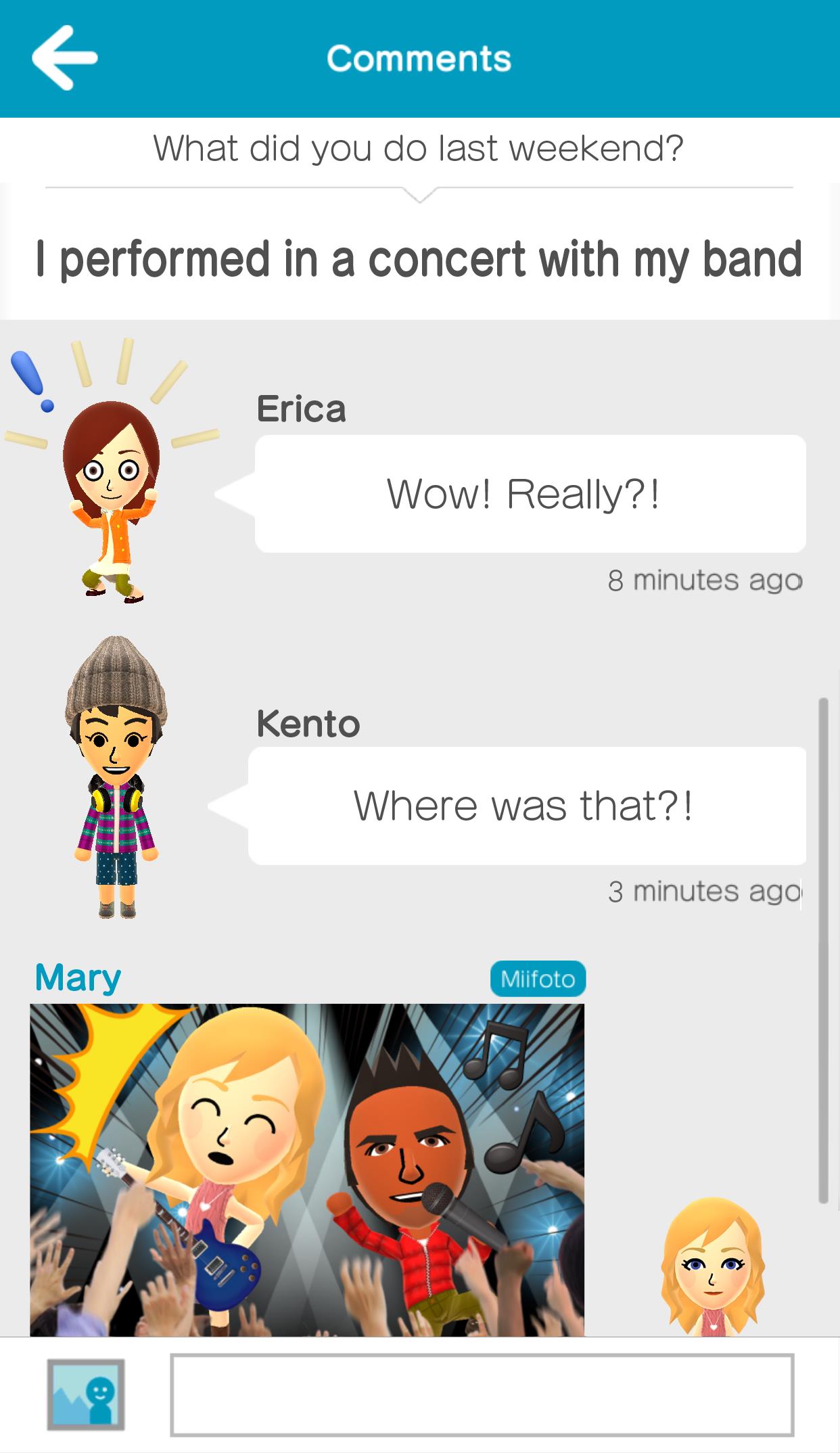 These “friendly communication starters” have an advantage that even the people who are less willing to send messages can easily participate. Another unique characteristic of Miitomo is that you may be able to find out unknown aspects about your friends or unexpected commonalities you share with your friend because Miitomo may pick up the topics that you usually do not discuss but would be willing to answer if asked.