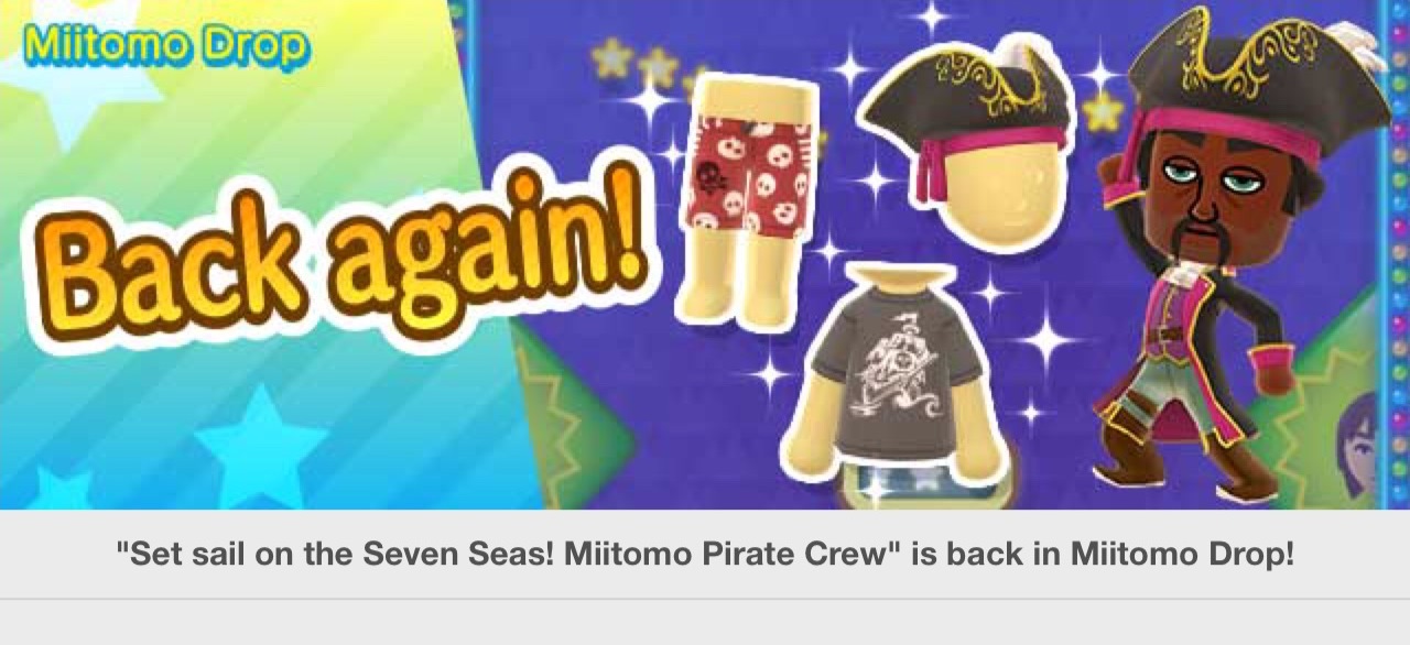 “Set sail on the Seven Seas! Miitomo Pirate Crew” is the returning theme. The stages provide the following: