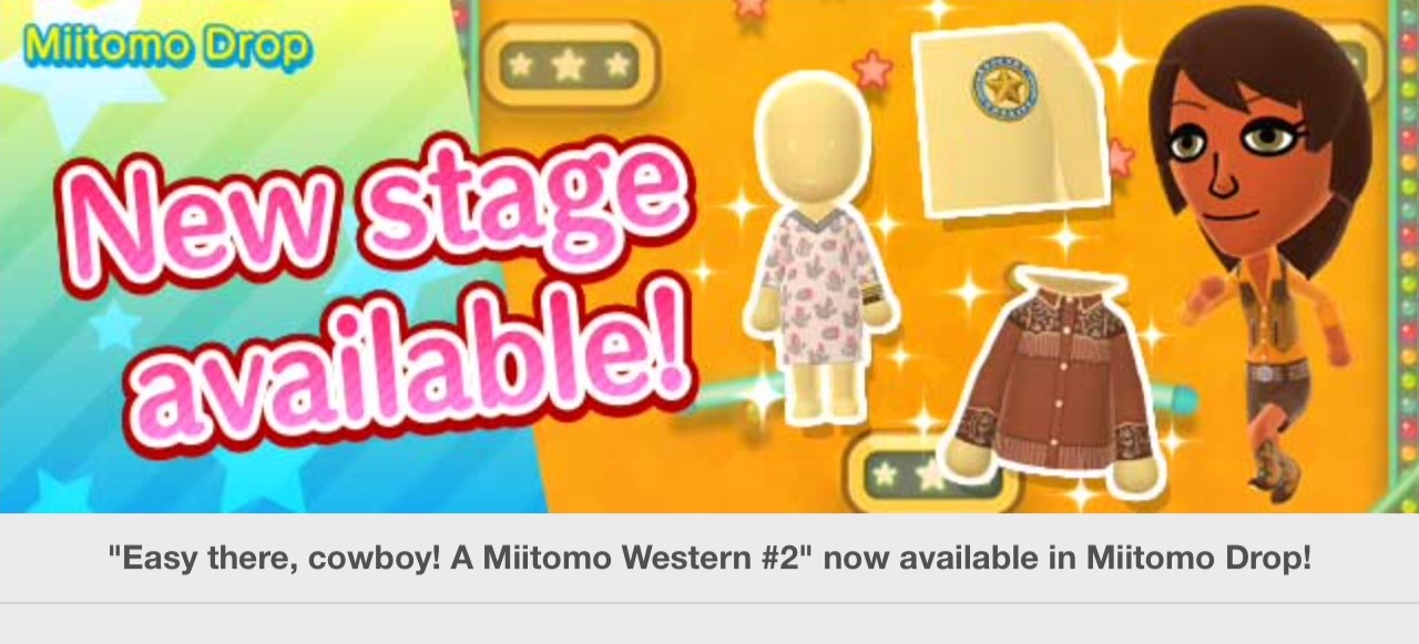 Miitomo has been updated with new content. Players can nab the latest items in the Miitomo Drop stage, “Easy there, cowboy! A Miitomo Western #2”.