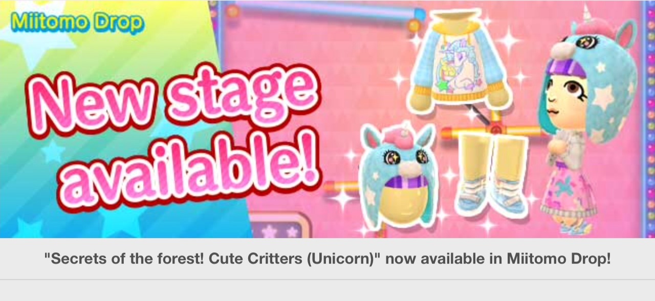 Miitomo has been updated with new content. Players can nab the latest items in the Miitomo Drop stage, “Secrets of the forest! Cute Critters (Unicorn)”.