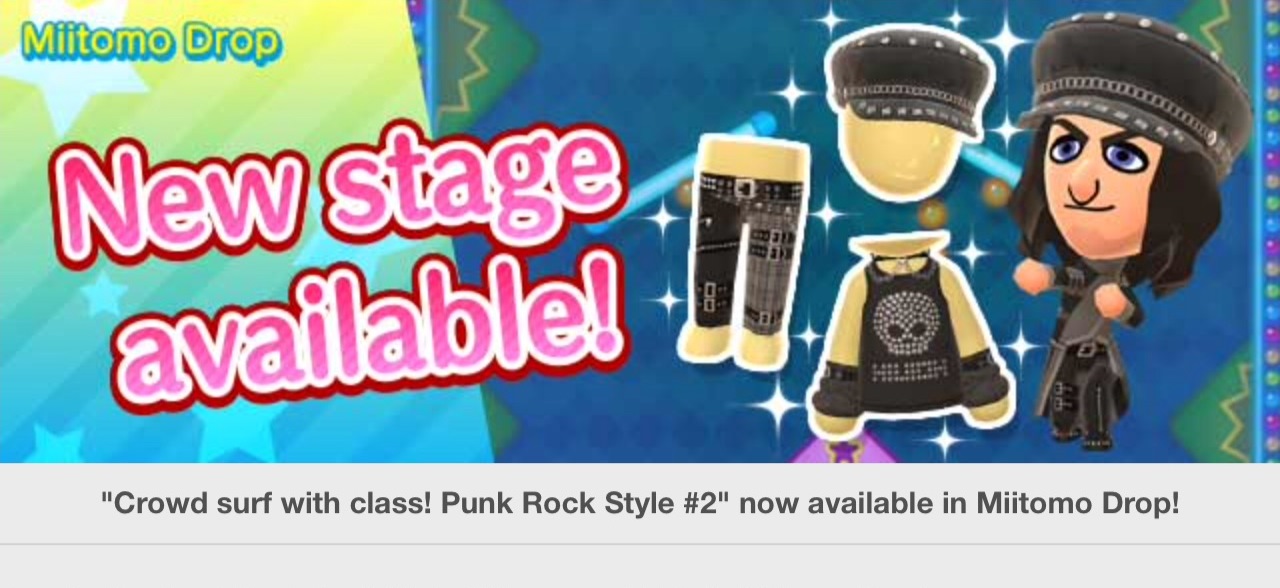 Miitomo has been updated with new content. Players can nab the latest items in the Miitomo Drop stage, “Crowd surf with class! Punk Rock Style #2”.
