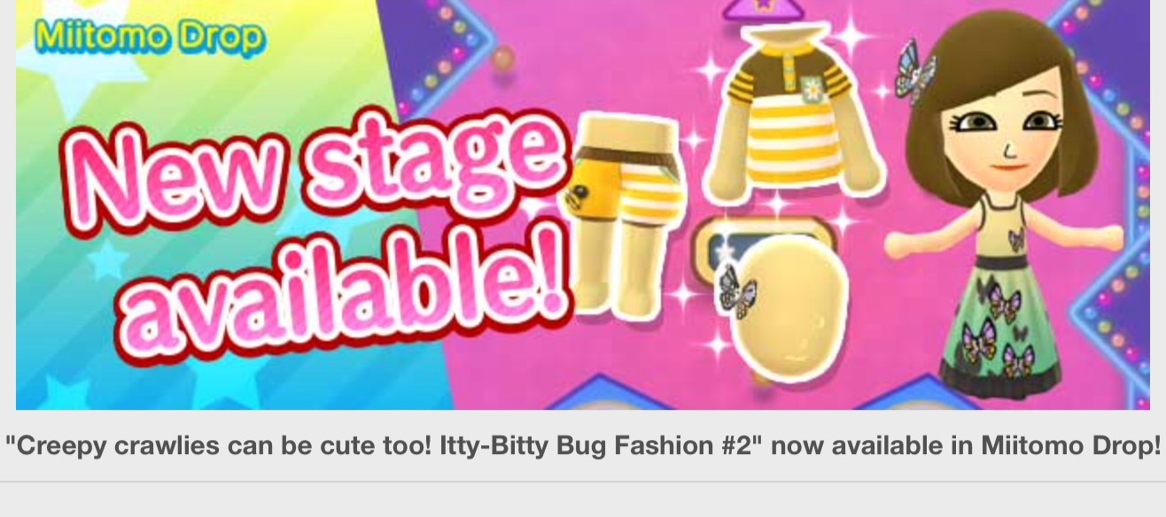Miitomo has been updated with new content. Players can nab the latest items in the Miitomo Drop stage, “Creepy crawlies can be cute too! Itty-Bitty Bug Fashion #2”.