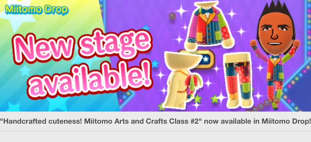 Miitomo has been updated with new content. Players can nab the latest items in the Miitomo Drop stage, “Handcrafted cuteness! Miitomo Arts and Crafts Class #2”.