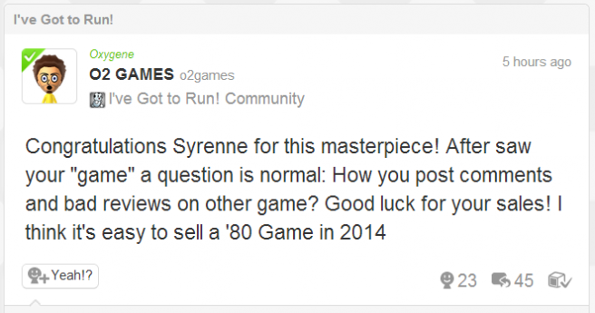 Syrenne McNulty reviewed one of Oxygene Media’s latest games, Fit Music for Wii U, as she is both a developer and journalist. Oxygene wasn’t pleased with the verdict, and after learning that McNulty is the creator of I’ve Got to Run!, posted the above message on Miiverse.