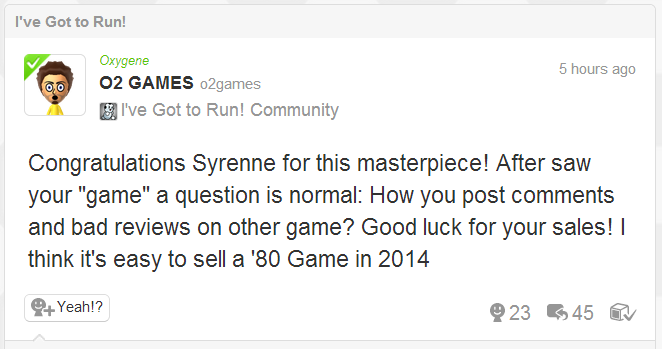 This is about as bizarre as it gets. Oxygene Media, who may now be most well-known for astroturfing on Miiverse, has slammed the developer of I’ve Got to Run! over a review.
