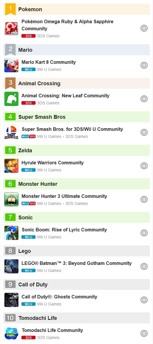 Nintendo published a listing of the most popular searches on Miiverse for this year, as of November 2014. Pokemon topped the list, followed by Mario and Animal Crossing.
