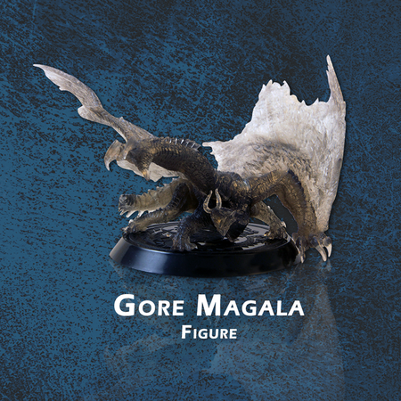 The package contains a copy of the game, Gore Magala figure, Felyne wearing Gore Magala armor pin, monster icon lanyard, cleaning cloth, and supply item box.