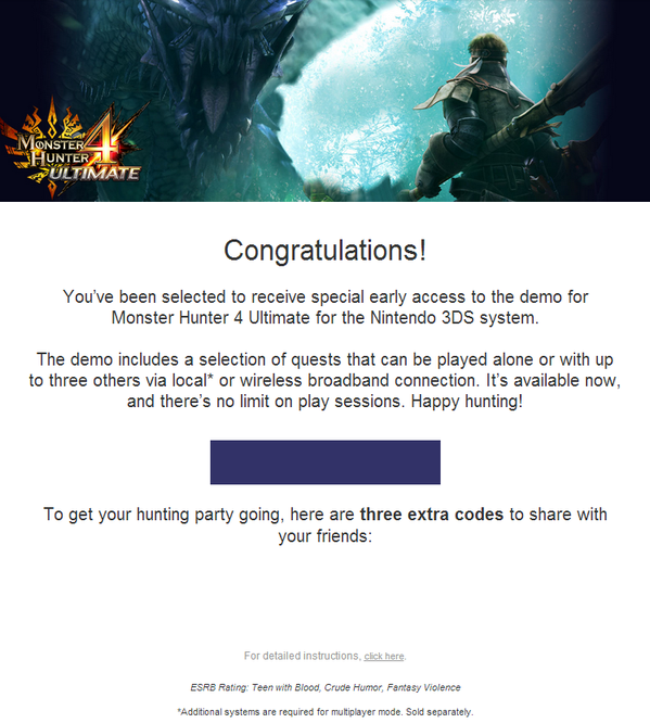 #MH4U Demo codes are being sent out by Nintendo! Keep an eye on your email inbox tied to your Club Nintendo account! Happy Hunting!