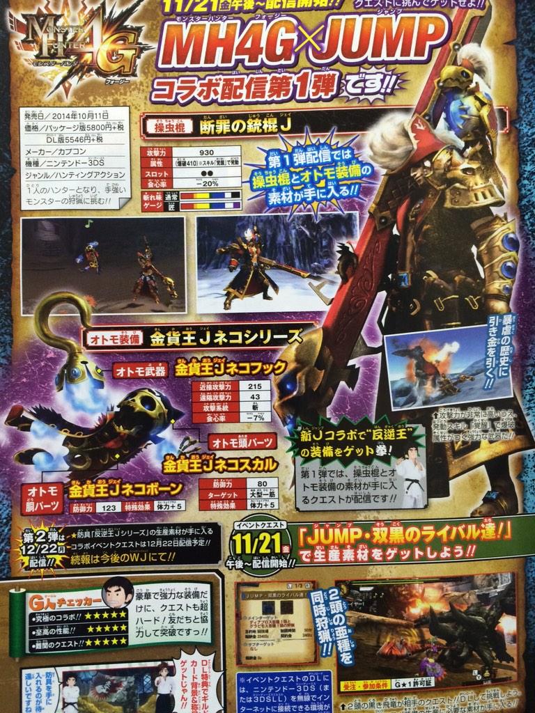 The first Jump quest roughly translates to “Arrive at the Rival of the Twin Blacks” and it will provide the Insect Glaive’s “Gun Mix of Condemnation J”. Players will also receive equipment parts for their Felyne, including a new weapon, helmet, and body armor (all can be purchased with the “Gold Coin King J Nekofukku”).