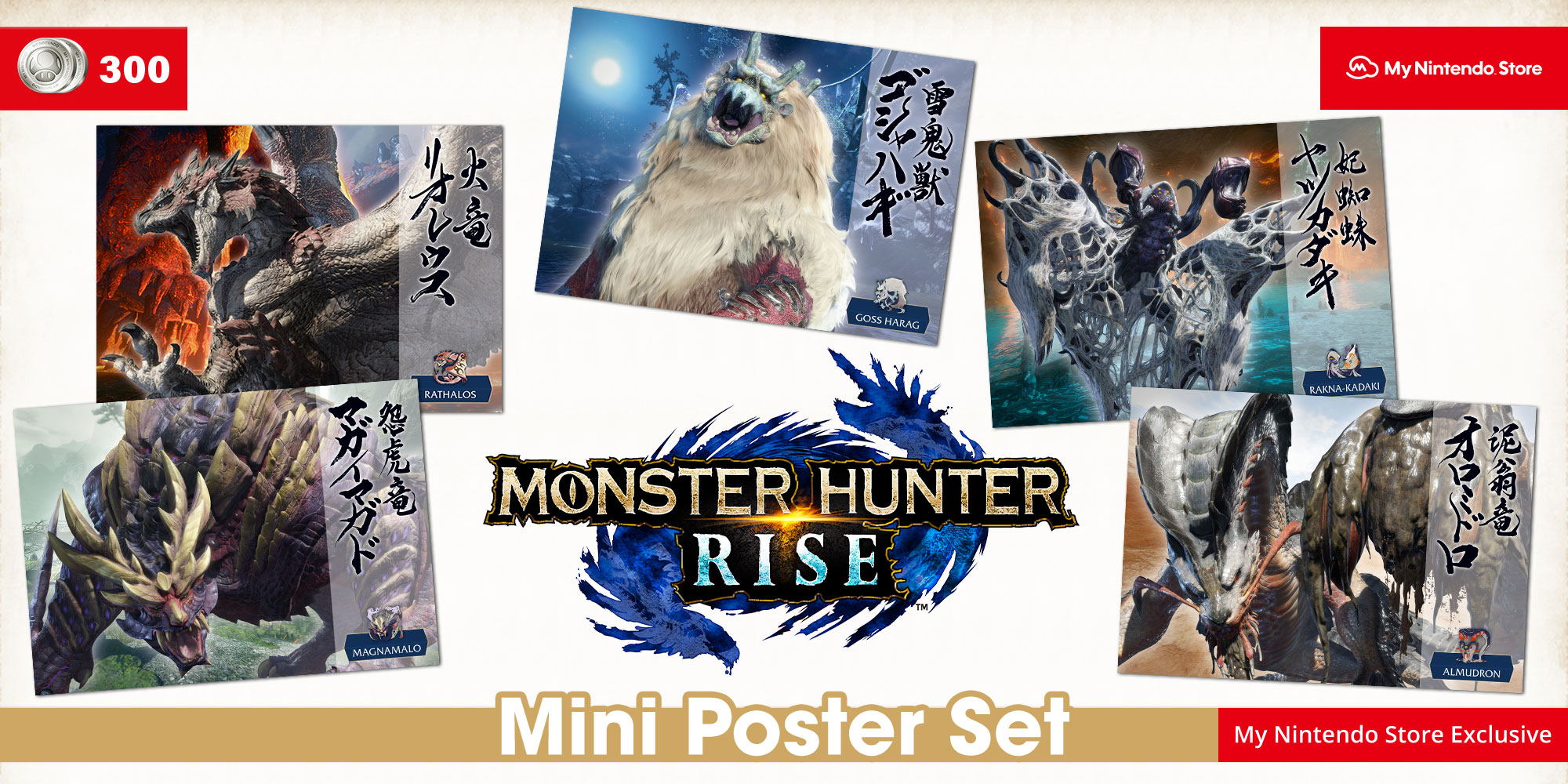 For My Nintendo members in Europe, a new Monster Hunter Rise mini poster set is up for grabs. Five are included in total. The designs feature Magnamalo, Rathalos, Goss Harag, Rakna-Kadaki and Almudron.