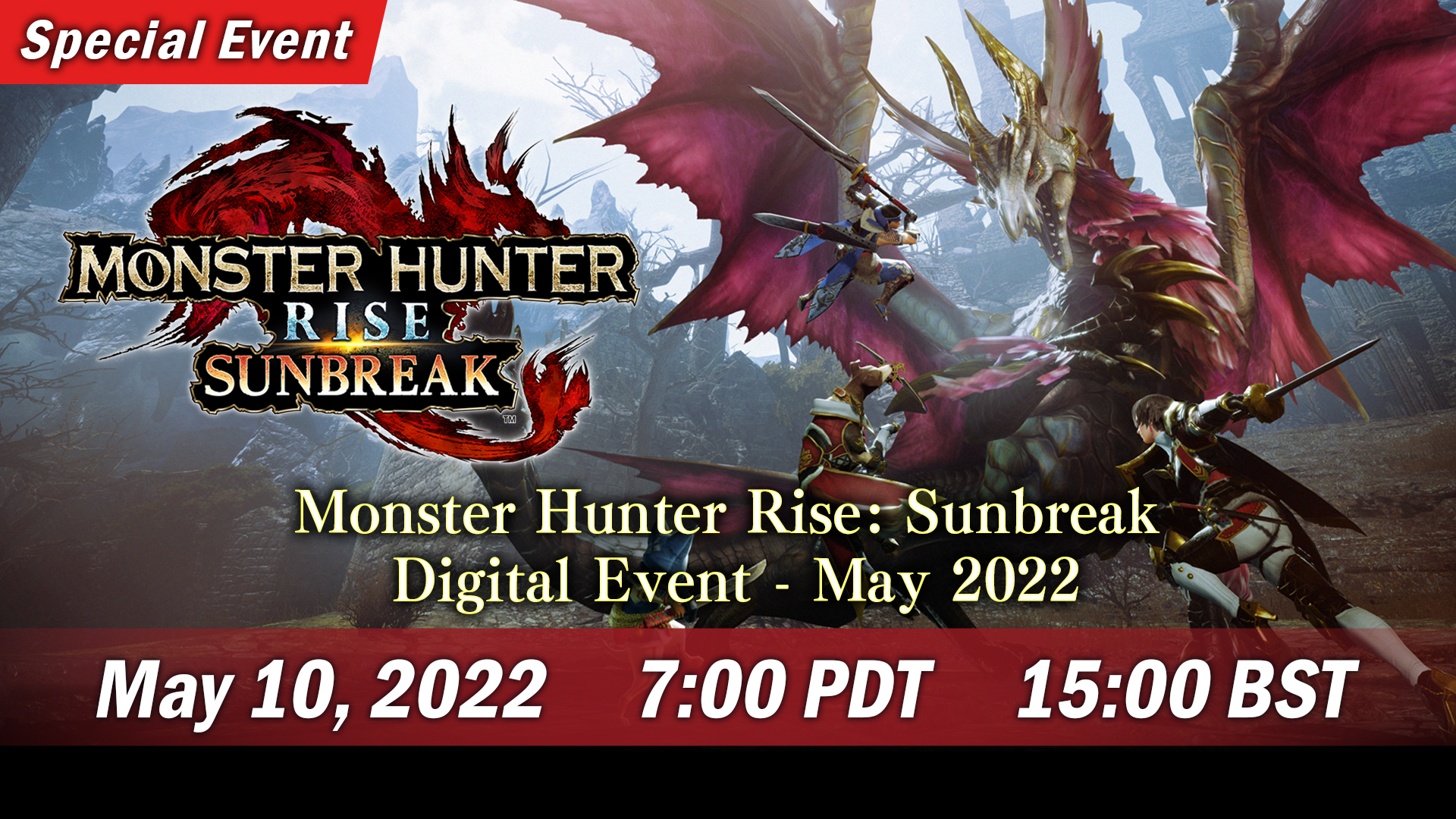 The Monster Hunter Rise: Sunbreak Digital Event will air on Capcom’s official Twitch channel here on May 10 at: 7 AM PST / 10 AM EST / 3 PM in the UK / 4 PM in Europe. As usual, we’ll provide coverage for the event when it goes live.