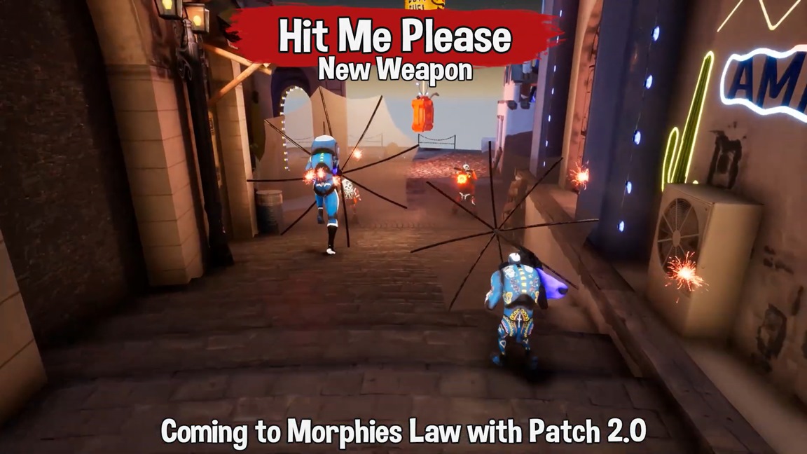 Cosmoscope has rolled out the latest preview video for Morphies Law 2.0. We now have a look at a new umbrella weapon, in which you can “charge forward whilst protecting yourself until that last moment when you’re upon the enemy.”