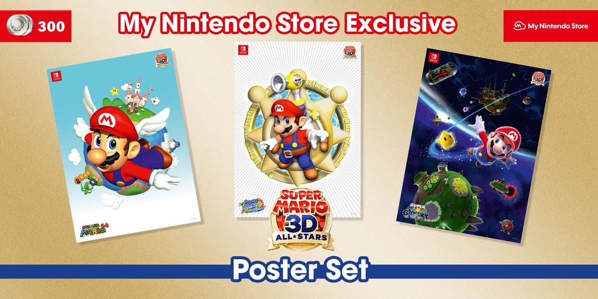 My Nintendo has updated in Europe with a new reward. For 300 Platinum Points, fans can get their hands on a set of posters for Super Mario 3D All-Stars. Super Mario 64, Super Mario Sunshine, and Super Mario Galaxy are featured.