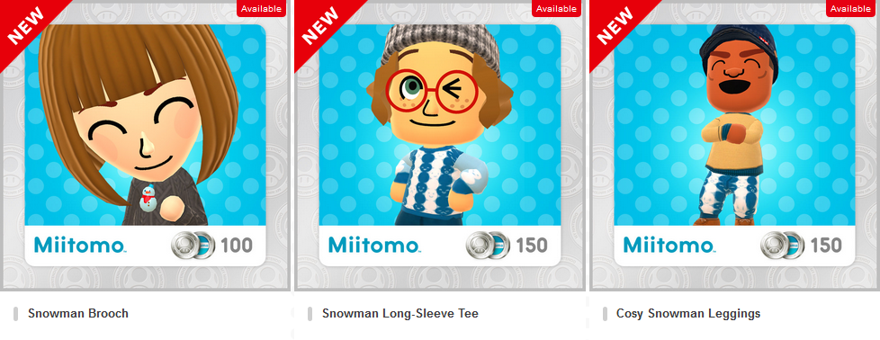 Three new snowman-themed Miitomo rewards have been added to My Nintendo. The Snowman Brooch costs 100 Platinum Points, and the Snowman Long-Sleeve Tee and Cosy Snowman Leggings cost 150 Platinum Points each. All three rewards are available until February 28th, 2017.