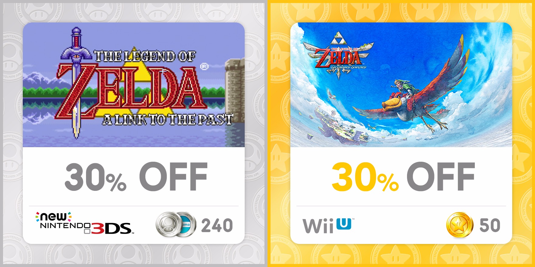 Aside from today’s new 3DS theme and orchestra videos, My Nintendo has also added in discounts for a pair of Zelda titles. The Legend of Zelda: A Link to the Past for Wii U / New 3DS and Zelda: Skyward Sword for Wii U are 30 percent off.