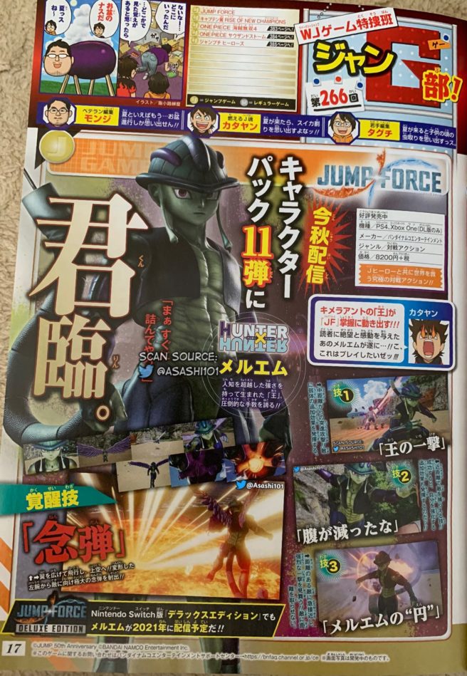 The latest issue of Weekly Jump has revealed the first DLC character for Jump Force to be Meruem from Hunter x Hunter. Jump Force is already out on other platforms, but the Deluxe Edition that includes Character Pass 1 is due out for Switch on August 27 in Japan and August 28 in North America and Europe. What other DLC characters do you hope to see? Special thanks to Gematsu for the screenshot and information.