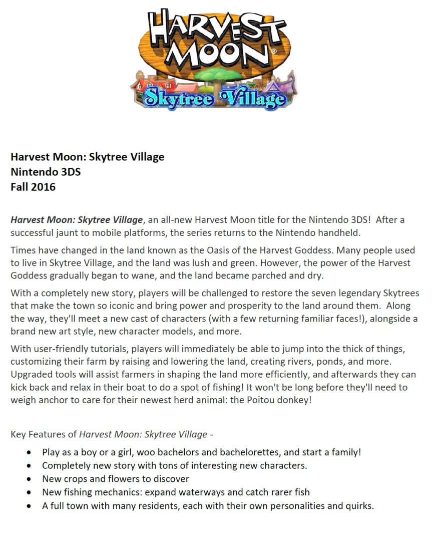 Natsume is handling Harvest Moon: Skytree Village in North America. But in Europe, Rising Star Games will be publishing. The company has announced that PAL regions will have the game sometime during Spring 2017.