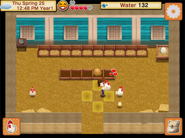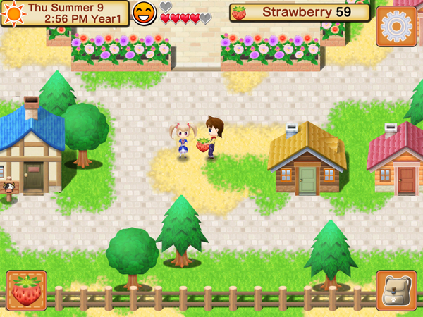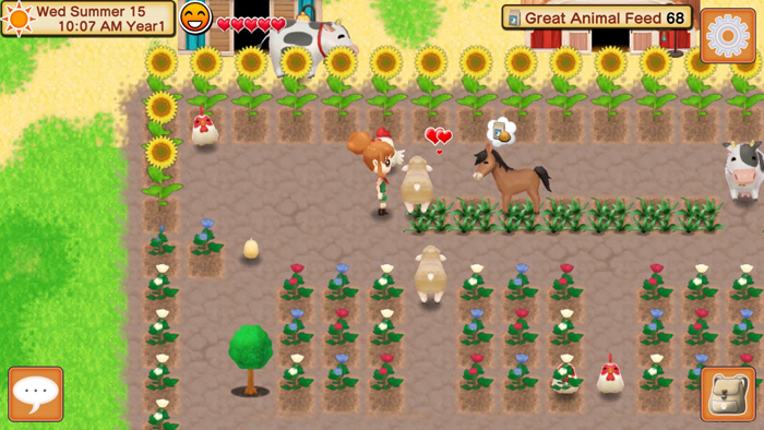 Hello, everyone! This is Taka, the producer of Harvest Moon: Seeds of Memories, a new Harvest Moon game coming to iOS soon as well as Android, Wii U, and PC in 2016. We know fans were very excited by our reveal of our first screenshots for the mobile versions, and we're excited to bring you a new treat today. To show you how Harvest Moon: Seeds of Memories looks in action, we've made a little video for you of the iOS version. But let me step aside and have Mike (that is what I named him, but you can name your character whatever you want) take over…—–Hey there, everyone! Mike here! I thought it might be cool to show you my average day here in Chestnut Town, so let's get right to it.I start the day off by taking care of my pets. I have two: a bobcat and a dog. I still dunno how I was able to train that bobcat, but hey, it hasn't tried to eat me yet! I make sure to feed them both before I leave for the day.After leaving the house, it's time to take care of my crops! Luckily, Brutus has upgraded several of my tools, so watering is a cinch! It looks like there's some spinach that's ready to be harvested today. Perfect timing! I also take this time to clear my land of any stray rocks or weeds that may have popped up overnight.Next, it's time to take care of my animals. First, I clean up the barn using my pitchfork. I can use the compost I clean up as fertilizer, though, so it's not as bad as you might think. Some of my animals need cleaning as well, so I take the time to do that too. Normally, I would also milk and sheer any animals that need it, but it doesn't seem like they do today. Naturally, before I leave, I make sure to leave feed in their feedbox, as they're quite hungry in the morning!After that, it's off to my chicken coop. Just like my barn, I clean it up using my pitchfork. You might not think it to look at them, but chickens need to be loved and held, so I take the time to do that before gathering the eggs they've laid. Just like the animals in my barn, my chickens are hungry in the morning, so I feed them before I leave.Next, it's off to the mountain to see the girl I've got my eye on, Andrea! She's an ore researcher, but also likes to relax at the bar after work. My kinda gal! In any case, I make it a point to talk to her every day, as well as give her a gift. I still haven't confessed my feelings to her, so get kinda nervous when I talk to her these days…While I'm at the mountain, I figure I should get in some fishing for the day. Let's see what I can catch today… A crucian carp? Not bad. And a pretty big one, too!Now it's time to head to Chestnut Town. I want to sell Sam some broccoli, so I talk to him first. Boy, that Sam sure has a unique way of talking! At first, it was a bit difficult to understand what he was saying to me, but now I gots it down, capisce?Next, it's off to Iris' Flower Shop to pick up some flower seeds. I've had my eye on these white rose seeds for a while, so let me get…let's see, how about 15 of them? Oh no! My bag is full! But that's OK! The seeds I just bought were sent directly to the storage in my house, so I can just take them out from there when I get home.After that, I think I'll stop by Hanna's Restaurant to say "hi" to Hanna and her daughter, Emily. Hanna's food is amazing! I've bought some of her recipes so I can cook her dishes at home. Anyway, her daughter Emily is great, too. She's a bit too hyper for my tastes as far as romance goes, but some people like that in a girl. She's a great friend, though!Finally, it's off to bed for the day. *Whew*! I'm exhausted! Farmwork starts early in the morning, so it's best to get to bed around 10 PM or so. And who knows what tomorrow may bring? I need to be prepared for anything!