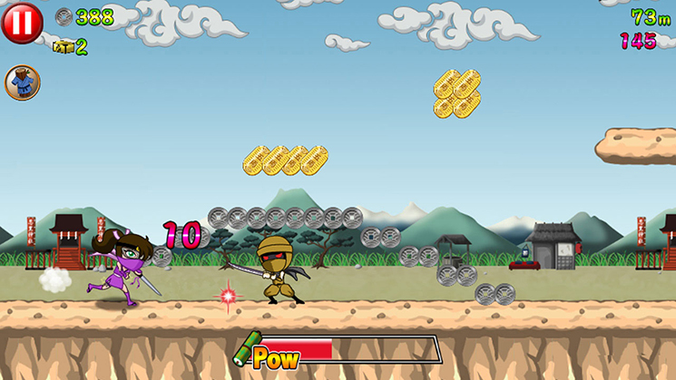 “Run, fly, and slash enemies to get the stolen treasures back. Ninja Strike: Dangerous Dash is a high-speed, action-packed, side-scrolling game! Players can choose from three “ways” of the Ninja: Run and jump over enemies or slash them to keep running, collect coins enemies drop to level up your ninjas. Whether you go with strength or triple jumping, there is a ninja for you! Choose from 5 different ninjas, each with their own special characteristics. You’ll face much more than just run-of-the-mill henchmen. Use your hard-earned coins to level up a variety of skills that will help you get further and make you tougher. Pick the skills that best fit your playing style. How far can you go?”