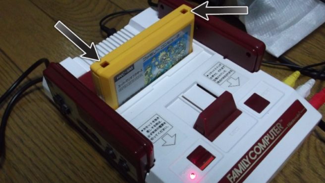 One interesting aspect about the Famicom is that the cartridges have two holes at the top. On the NES, these don’t exist at all. NES cartridges have indentations at the top, which we know are used to snap the cart in place.