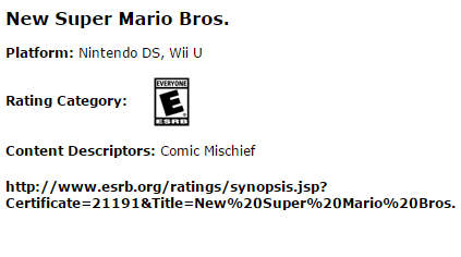 New Super Mario Bros. could be coming to the Wii U Virtual Console soon. A rating for the game popped up on the ESRB, which usually signals that a release is on the horizon. It wouldn’t be too surprising to see New Super Mario Bros. on the eShop this Thursday, though we’ll have to wait for the latest Nintendo Download report to see what’s heading to the VC.