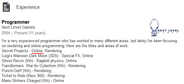 Rogers also poked around the profile of presentation/level designer Diego R. Pons, who has been at the studio for eight and a half years. Whereas “Collectibles” are listed for Luigi’s Mansion: Dark Moon and Spider-Man, it’s not listed for Next Level Games’ unannounced project. Pons also lists “Story” for the new game, and it seems that his responsibilities focus more on mission-based games/more open environments.