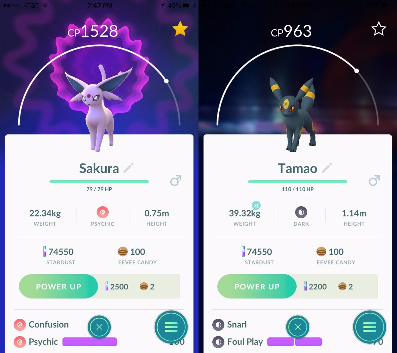 Now that Pokemon GO has received over 80 new Pokemon, the latest Eevee evolutions Espeon and Umbreon are in. Just like with the original trio, you can again use the naming trick. For Espeon, name your Eevee Sakura. And for Umbreon, use Tamao.