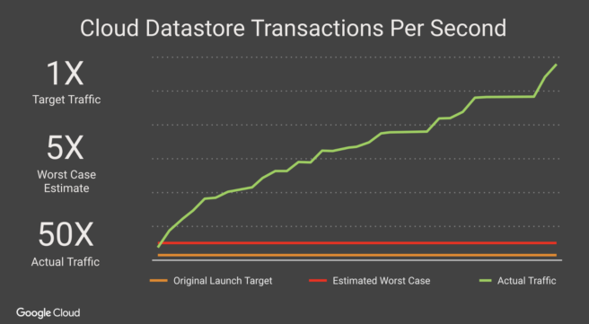 Google Cloud’s Luke Stone wrote up a blog today and included a graph that gives us another look at just how much Pokemon GO smashed through expectations. An estimated target and worst case scenario were considered, but as you can see, both were shattered.