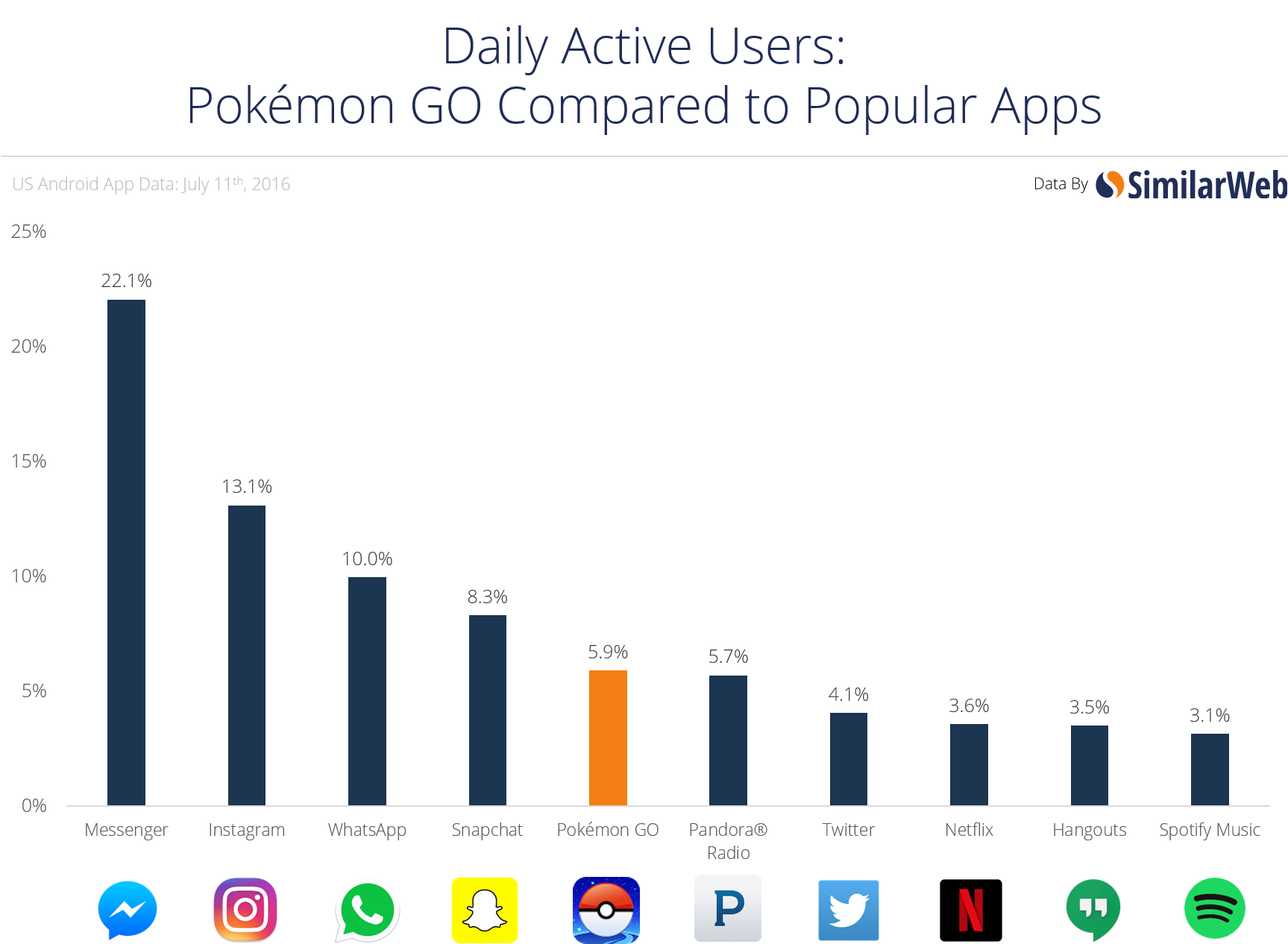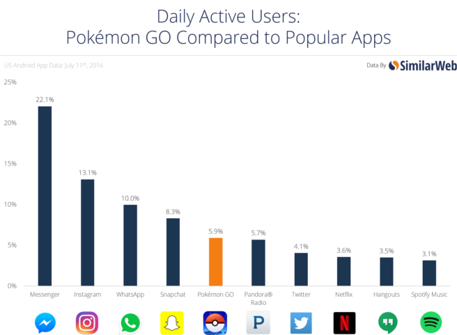 Pokemon GO has managed to leap over another set of popular apps. According to SimilarWeb, it’s now surpassed Pandora, Twitter, Netflix, Hangouts and Spotify for daily use in the United States. The report goes on to speculate that Snapchat, WhatsApp, and other popular social apps will be next based on Pokemon GO’s performance.