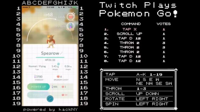 “Crowdsourced Pokemon Go! Twitch chat decides where to send our player. Our player moves based on the most popular commands in the chat (democracy mode).