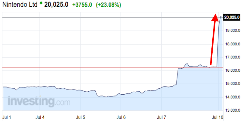 Business Insider reports that Nintendo shares rose roughly 10 percent on Friday. And today, in early trading in Tokyo, shares increased as much as 23 percent. Bloomberg’s David Ingles notes that this is the best one-day move for Nintendo stock since 1983.
