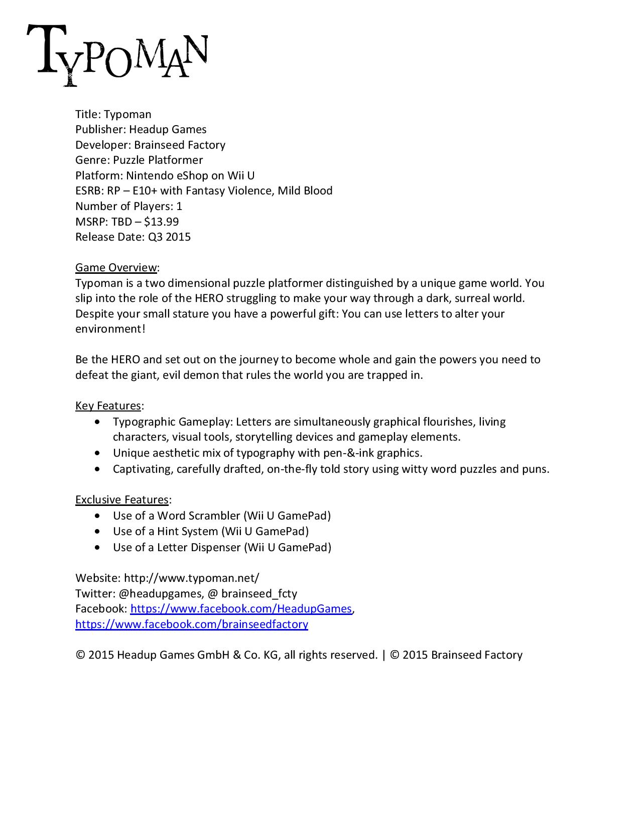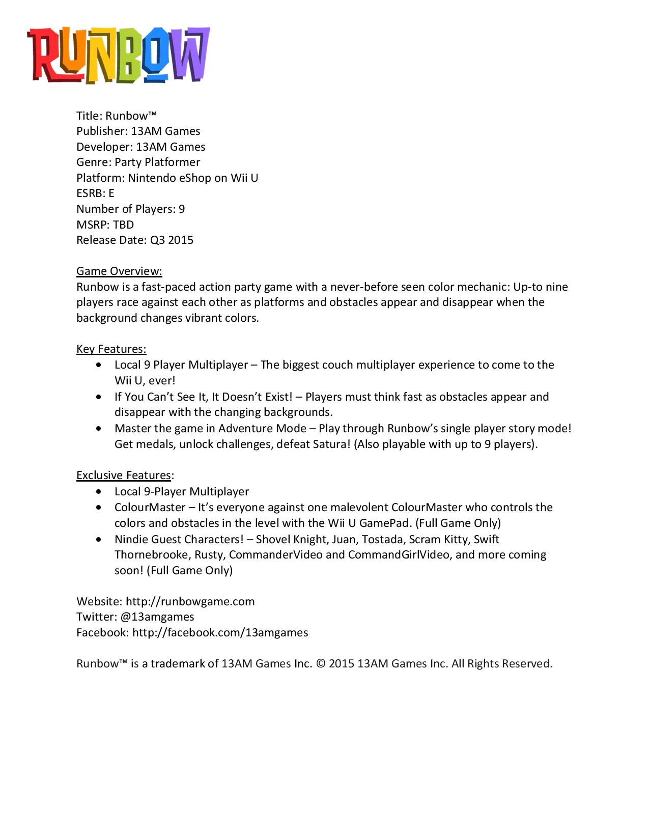 We reached out to five developers who were involved with Nindies@Home to share some thoughts about participating in the program. Below you’ll find some musings from 13AM Games (Runbow), Brainseed Factory (Typoman), MixedBag Games (forma.8), Ripstone (Extreme Exorcism), and Wales Interactive (Soul Axiom). What was it like for these studios to participate in Nintendo’s newest eShop initiative? How was it getting the demos up in time for E3? How do they feel about the program as a whole? These were just some of the topics the developers we reached out to touched upon, and each team shared some very interesting insight about the process of being included in Nindies@Home. Continue on below for their thoughts.