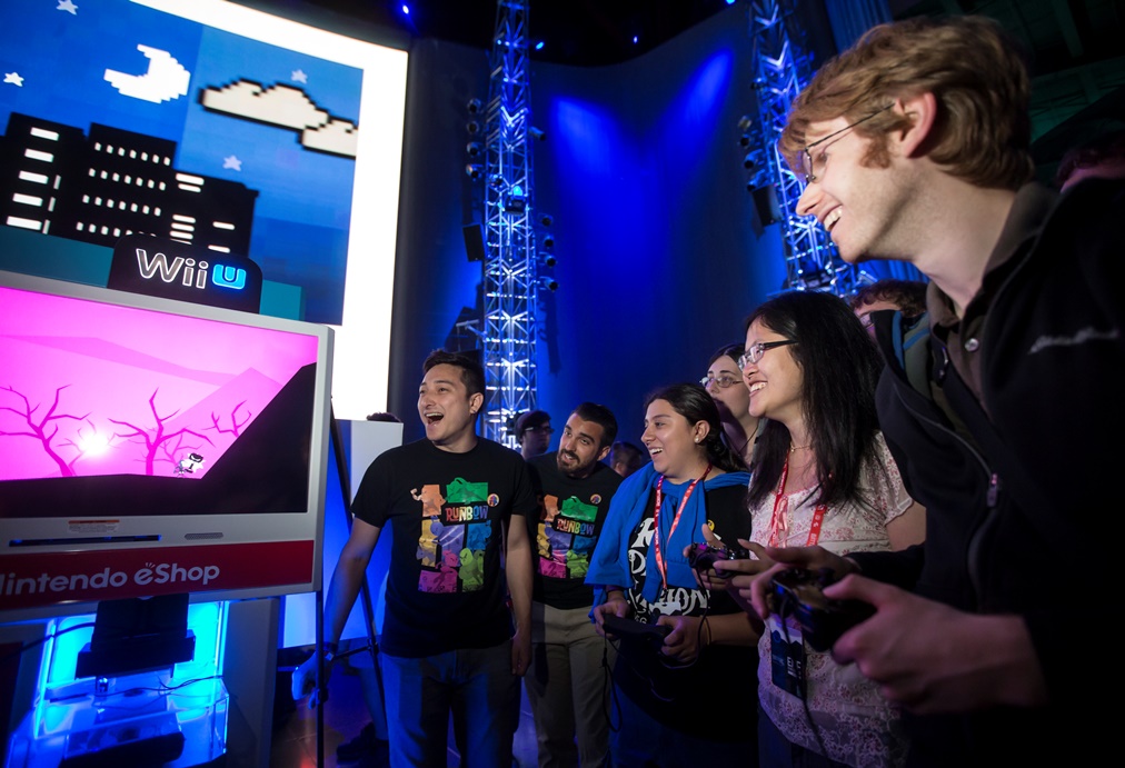 In this photo provided by Nintendo of America, attendees compete in a wild nine-player multiplayer race in Runbow by 13AM Games at Nindies@Night, a special event celebrating recently released and upcoming independent games at EMP Museum in Seattle on Aug. 27, 2015. The free event featured a presentation from “Nindie” developers, many different playable games, multiplayer competitions and giveaways.