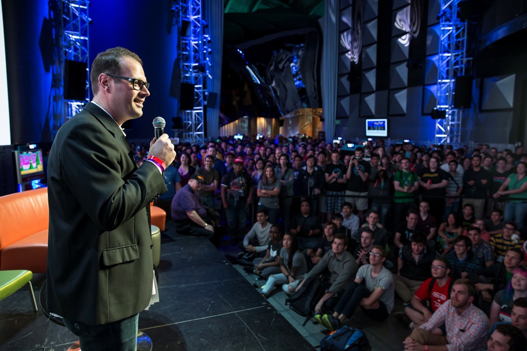 In this photo provided by Nintendo of America, Damon Baker from Nintendo announces Kerbal Space Program from Squad for Wii U at Nindies@Night, an exclusive Nintendo event at EMP Museum in Seattle on Aug. 27, 2015. The free event featured a presentation from “Nindie” developers, many different playable games for Wii U and Nintendo 3DS, multiplayer competitions and giveaways.