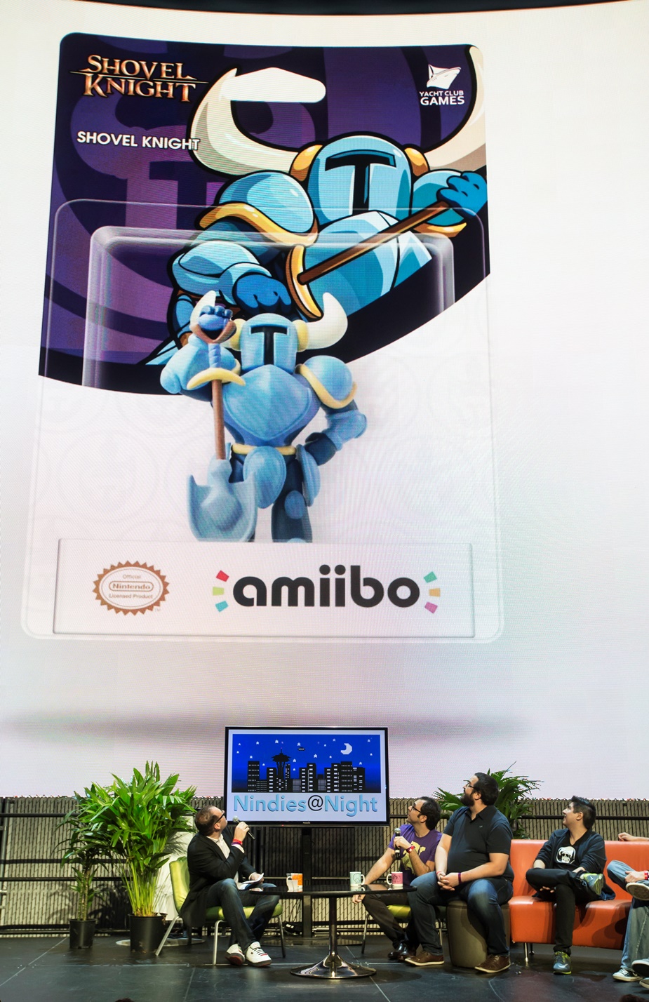 In this photo provided by Nintendo of America, Yacht Club Games reveals their Shovel Knight amiibo during Nindies@Night, an exclusive Nintendo event at EMP Museum in Seattle on Aug. 27, 2015. The free event featured a presentation from “Nindie” developers, many different playable games for Wii U and Nintendo 3DS, multiplayer competitions and giveaways.
