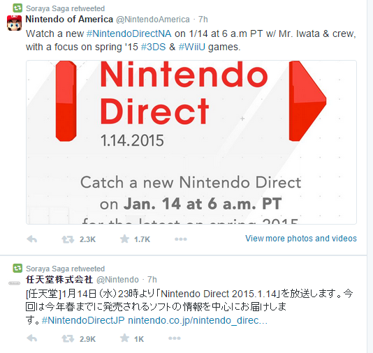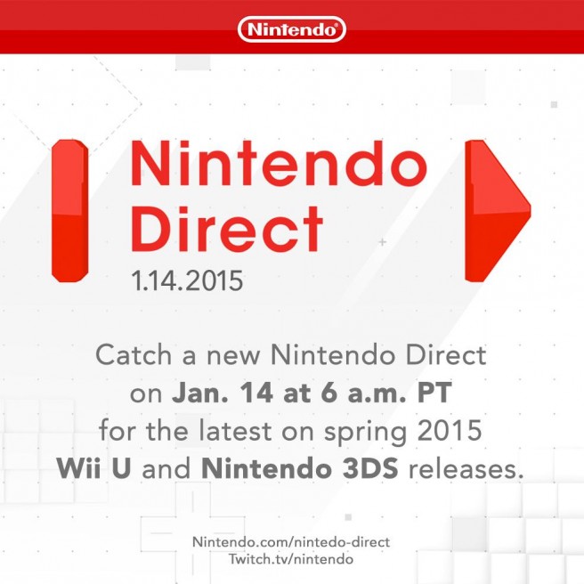 Watch a new #NintendoDirectNA on 1/14 at 6 a.m PT w/ Mr. Iwata & crew, with a focus on spring '15 #3DS & #WiiU games. pic.twitter.com/G58Cs1PZZM