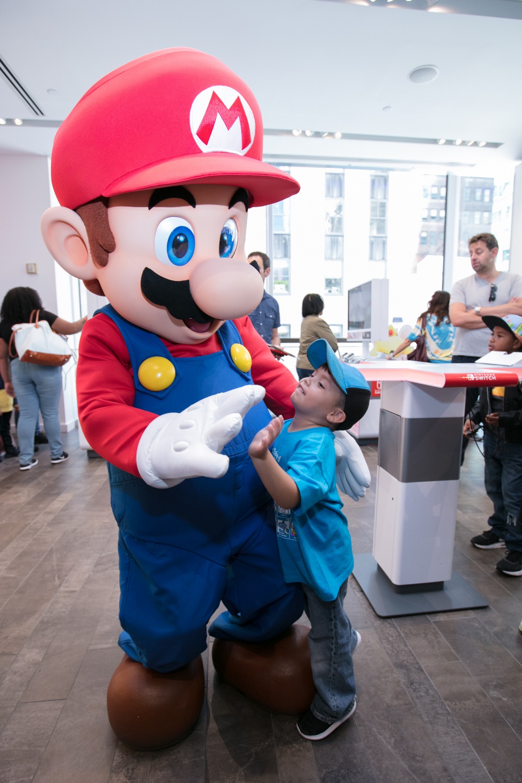 In this photo provided by Nintendo of America, Alessandro A., age 4, from Woodside, NY, greets Mario at the Nintendo NY store during the Nintendo Back-to-School Celebration.Photo 4