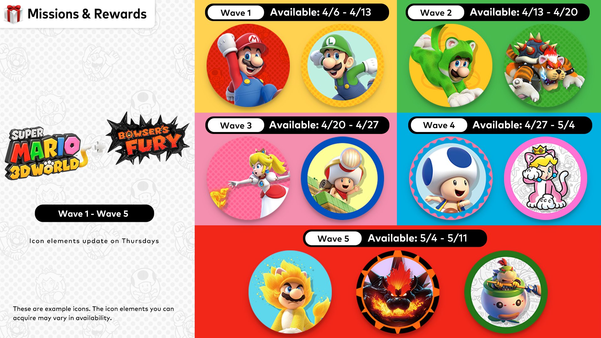 Original (4/6): The Nintendo Switch Online app just started up a new round of user icons for Super Mario 3D World + Bowser’s Fury. Five waves are planned in total, with the lineup rotating out every Thursday. It should all wrap up on May 11.