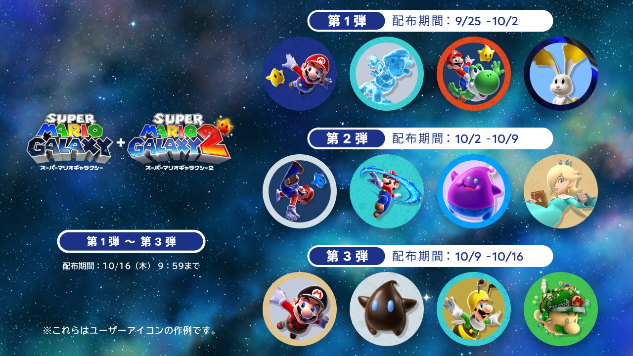 The company tends to celebrate its new releases with user icon drops. For Super Mario Galaxy + Super Mario Galaxy 2, this will be starting next week. Fans can grab icons starting on September 24 (September 25 in Japan), which is one week before launch. Three waves are planned in total.